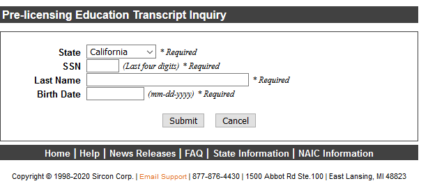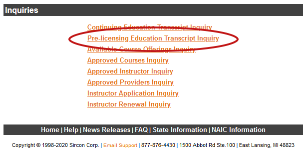 The first step is to head over to the Sircon website's Pre-Licensing Education Transcript Inquiry
